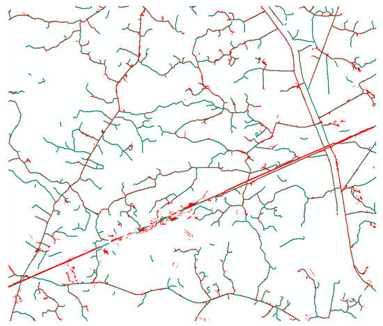 Figure 17 shows the overlap of the extraction result of the proposed method based on geometric feature inference (GFI) and the result of the OOC method. The total length of the roads extracted by both methods is 51.26 km, the length of roads that have been detected by GFI but missed by OOC is 39.37 km, and the length of roads that have been detected by OOC but missed by GFI is 5.48 km.