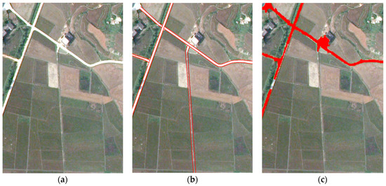Figure 19b that a large farmland ridge is wrongly identified as a road by GFI because it has two obvious boundary lines, and its width is similar to a road’s. However, the OOC method obtains the correct result since the farmland ridge has different spectral and texture features from a road. Spectral and texture information would be taken into account in our method in future to increase the extraction accuracy, especially for high-resolution images with more spectral bands.