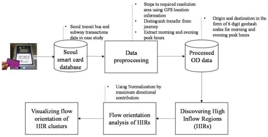 The remainder of this paper is structured as follows. In Section 2, the related work is discussed. In Section 3, the methodology for processing smart card transit data, discovering HIRs, and analyzing flow orientation of these regions is presented. In Section 4, the proposed methodology for flow orientation analysis is demonstrated with a smart card transit data collected in Seoul, Korea. Section 5 makes concluding remarks and describes future work.