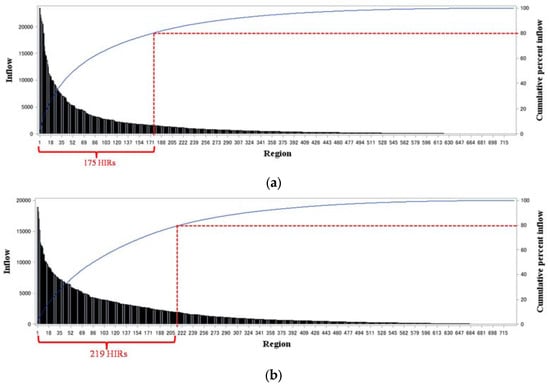 In this subsection, the morning and evening peak datasets were investigated separately to identify the HIRs where the majority of day and night activities were concentrated. The Pareto principle was also assumed that 80% of the output was produced by 20% of the input to deal with major flow orientation patterns. The inflow distribution of regional inflows in the morning and evening peak hours is shown in Figure 3. In the figure, HIRs were sorted in descending order of the number of inflows. It could be found that the top 23% of regions (175 of 730 regions) had charge of 80.7% of trips (0.88 million among 1.09 million trips) for morning commutes, and the top 30% of regions (219 of 731 regions) had charge of 80.0% of trips (1.04 million among 1.30 million trips) for evening commutes.