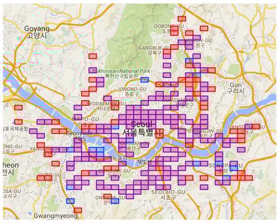 HIRs extracted in Seoul. 159 HIRs in purple both for morning and evening commutes, 16 HIRs in blue only for morning commute, and 59 HIRs in red only for evening commutes.