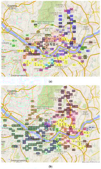 Clusters of HIRs in Seoul. (a) Morning commute HIR; (b) Evening commute HIR. Their hierarchical clustering progress can be seen in Appendix A.