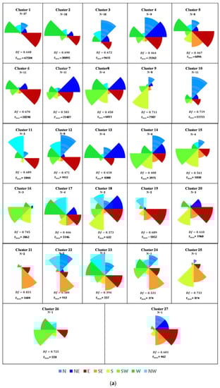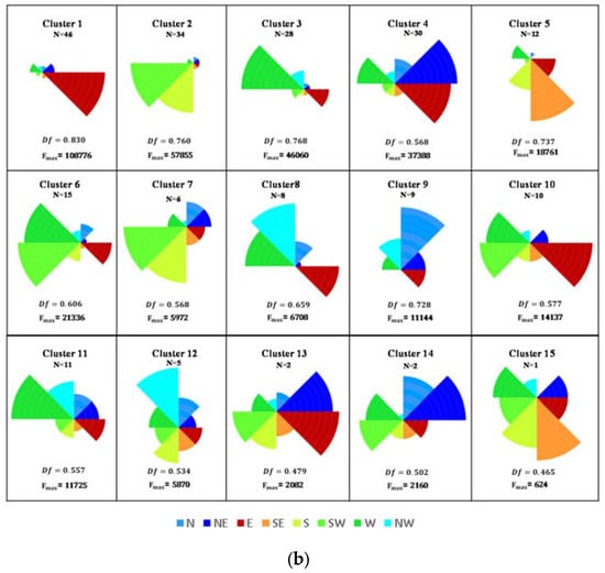 In this study, the similarity between the directional inflow vectors Fi of two HIRs was used to cluster the HIRs with AHC. Since Fi represents the normalized flow orientation from all eight directions for the HIR, clustering HIRs for Fi can find similar flow orientation patterns among HIRs. More specifically, average link clustering based on the Euclidean distance was opted. This clustering was justifiable in line with identifying HIRs having similar flow orientations. Figure A1 in Appendix B shows two dendograms representing the progress of hierarchically clustering the HIRs for morning and evening commutes. Based on the evaluation measures of cubic clustering criteria, such as R-square, pseudo f, and pseudo T-square, 27 HIR clusters for the morning commute and 15 HIR clusters for the evening commute were identified. The results of HIR clustering for the morning and evening commutes were visualized with df and fmax as shown in Figure 5.