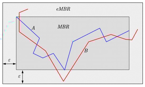 As shown in Figure 4, the MBR of the target trajectory is extended by , and the candidate trajectory that satisfies the query criteria must be located in it. Therefore, the MBR filtering could make the scale of candidate set further smaller.The filtering steps are as follows: