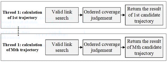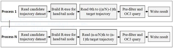 Considering that the target dataset and the candidate dataset often contain a large number of trajectories, it is sensible to combine parallel threshold query of multiple target trajectories and parallel ordered coverage search of a single target trajectory based on multiple processes and multiple thread. The parallel tragedy is illustrated by Figure 6 and Figure 7.