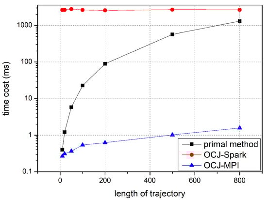 As illustrated in Figure 8, with the increase of the trajectory length, the efficiency of the OCJ algorithm in the Spark platform remains basically the same. This is because the distributed computing platform needs time to carry on the complex data structure, the parallel task division and the parallel resource scheduling before running the actual algorithm, even if the task quantity is very small. The preparation time almost stays the same and the calculation cost of the distance judgement of the single-pair trajectory is almost negligible compared with it, so the total task execution time is hardly affected by the trajectory length. Meanwhile, the OCJ algorithm implemented by the MPI parallel framework shows different performance in that with the increase of the trajectory length, the calculation time grows in a stable linear manner. Obviously, the traditional algorithm’s time cost grows much more steeply. It is evident that for the single-pair trajectory Fréchet distance threshold judgement task, the OCJ algorithm implemented in the MPI framework has a significant advantage in terms of computational efficiency.