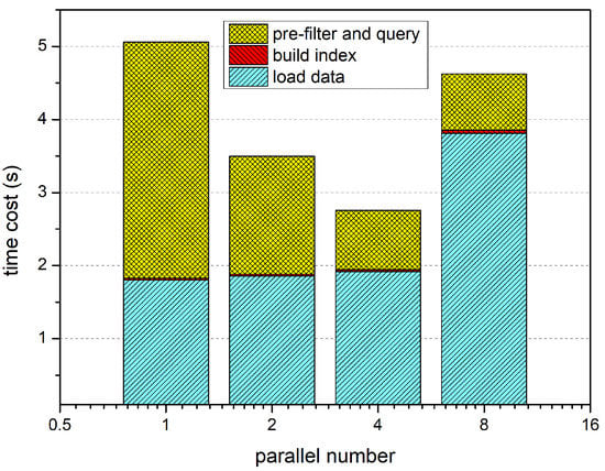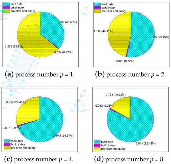 When analyzing the data loading phase, each process needs to load all the candidate trajectory dataset for a complete search. As declared in the beginning of Section 4, the program was run on a four-core desktop, which means that four different processes can be executed homochromously. So, the load time almost remains the same when the parallel number is less than four (the core number of CPU). However, when the parallel number is eight, double the core number of CPU, the reading process have to queue for their data, which results in the rise of loading time. Although by means of parallel read, cache acceleration and other hardware optimization measures, the total data IO time still occupies the majority of total time cost, and the greater the number of processes, the higher the proportion of data IO occupies. This phenomenon is demonstrated more clearly in the pie charts in Figure 11.