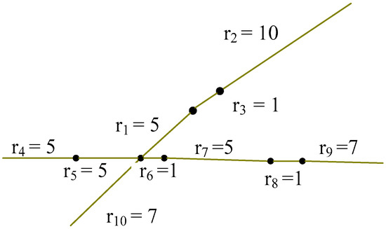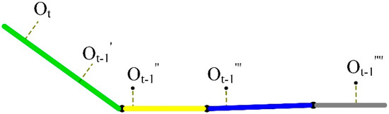 Emission probability means the observation probability distribution in each state qt at time t. Based on the basic geospatial analysis that event A is assigned with a greater reward to point P for being ‘closer’ to point P [37], it is reasonable to say that the shorter the project distance from one observation to nearby road links is, the greater the probability of being the true state for the observation. Here this work takes the connectivity information of the road network to calculate emission probability, with rules in Equation (12). Figure 4 shows a simplified road network to illustrate of state transition matrix. Table 1 illustrates the state transition matrix for road network in Figure 4.
