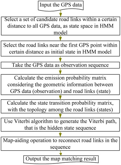 Map-matching is a process that is employed to find the actual road links for each estimated position, which can be viewed as hidden state sequence in the HMM model. With the topology relationships among the road links in a network, and the probability between estimated positions and nearby road links, HMM-based map-matching can be implemented to find the actual trajectory [11,42,43,44].