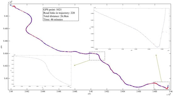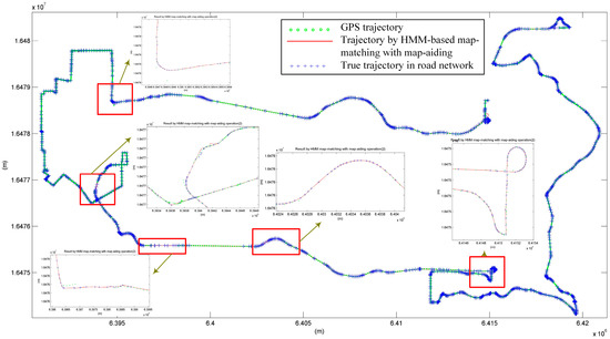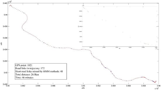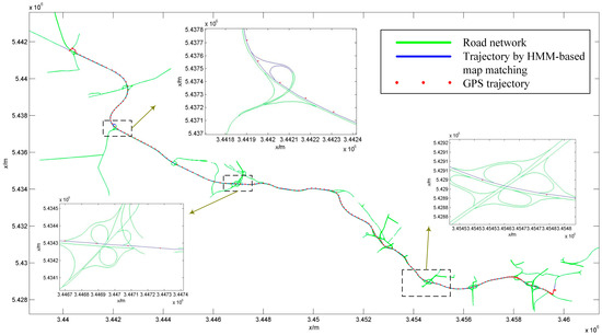 After analyzing the reasons for tiny “limitations” and short links linked with the object route, the methods were improved by map-aiding operation, which includes two steps. The first step is to connect all selected links despite a gap due to the missing GPS points. By calculating the distance between two successive GPS points and the length of the road links, we deduce that links at “limitations” area in the initial result are less than four links, which can be easily acquired by selecting links that are linked with the previous set of road links and repeated one time. The second step is to get rid of redundant road links around the true trajectory by calculating the refined road network again with HMM model. The details of Figure 11 show the result of HMM-based map-matching operation with map-aiding operation. Details in Figure 11 show the improvement of the HMM-based map matching with the map-aiding operation compared with Figure 10.