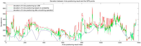 Mobile phone positioning by received signal strength matching is still with accuracy of 60–120 m in most existing applications [7]. The majority of existing map-matching methods cannot generate promising results for estimated locations with this level of accuracy. Figure 12 shows the positioning accuracy about the mobile positioning result by A-bis data from GSM network system (Sample rate is 0.5 Hz).