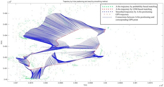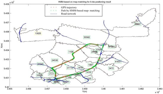 Two main error sources make this work challenging. Firstly, the accuracy of the preliminary positioning result is always an issue for map-matching algorithms in all contexts, such as GPS data positioning, pedestrian positioning and navigation, mobile phone positioning and indoor positioning. Different sensors have different limitations. The main common aspects of these error sources in map-matching include blocked signals, multi-paths for signal [1,2,3], and the smallest cover area of positioning data [4]. Second, the other part in the map-matching framework is the complex topological relationships among these shapes in traffic context, particularly when real trajectories and calculated trajectories are related to the context. For mobile phone positioning, which exploits the data from a cellular network system, the positioning results are highly sensitive to the local context [5,6,7]. The preliminary positioning result from mobile positioning are more complex than that the preliminary positioning results from other positioning methods [4,8]. Common map-matching methods are not effective for the positioning result with A-bis data from a Global System for Mobile Communication (GSM) cellular network system.