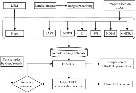 The framework of this research is illustrated in Figure 2 and includes the following major steps: (1) COST-based atmospheric correction; (2) remote sensing database construction; (3) LULC extraction using FBA-DTC; (4) accuracy assessment; and (5) LULC change analysis.