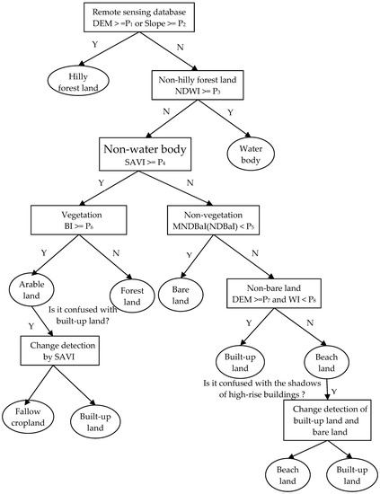 Because of its flexibility, intuitive simplicity, and computational efficiency, DTC has been widely used in raster data classification and thematic information extraction, especially remote sensing data. In the DTC process, features of remote-sensing data (i.e., DEM or bands) represent predictor variables, and the LULC classes to be extracted are target variables. The target variables are derived from a series of thresholds based on the distribution of features in the feature space [19]. In this study, FBA-DTC was used to integrate multi-spectral features derived from a number of remote sensing indices such as SAVI (soil adjustment vegetation index), NDWI (normalized difference water index), MNDBaI (modified normalized difference barren index), BI (brightness index), and WI (wetness index) with topographic features including DEM and slope. The FBA-DTC approach to extracting LULC type based on multi-features was developed as shown in Figure 3. According to our research objectives and a field survey, LULC in the study area consists of six classes: arable land (AL), forest land (FL), beach land (BEL), built-up land (BU), water bodies (WB), and bare land (BL).