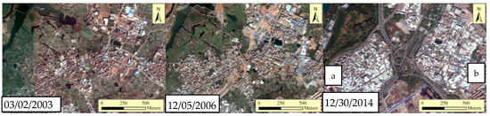 However, we found NDBaI could not distinguish white tin roofs in urban villages from bare land. With the dramatic urbanization, a vast area of buildings with bright roofs in Xiamen has sprung up in recent years. Most of them may be posed by new attics built with white tin on top of the original houses. Figure 4 showed the significant changes of white tin roofs from 2003 to 2014 in two urban villages, Gaolin and Wutong in Xiamen island. Therefore, we used a modified normalized difference bare index (MNDBaI) for bare land in cities in which a number of the white roofs exist. The equation can be expressed as follows: