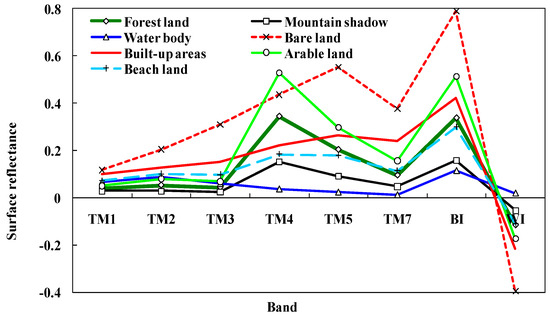 As shown in Figure 3, DEM and slope first are used to partition all pixels into two groups. The spectral characteristics of forests shadowed by mountains are similar to those of water bodies (Figure 5). However, certain forests typically grow above certain elevations or slopes, particularly in Xiamen. Therefore, topographic features can be used to distinguish mountain-shaded forests from other classes such as built-up land, water, and other vegetation types. NDWI is used to distinguish water from other classes because water has a higher NDWI value than that of other classes. SAVI can be employed to separate vegetated areas (forest and cropland) from non-vegetated areas (built-up land, bare land, and beaches). BI is helpful for distinguishing between forests and cropland because cropland corresponds to a higher BI value compared with forests.
