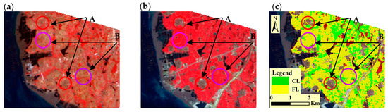Comparison of original images with undistinguishable fallow land and built-up land, and an arable land map: (a) original image in 2003; (b) original image in 2007; (c) arable land map extracted from feature-based approach of decision tree classification in 2003. Notes: A and B represent built-up land and fallow land; CL and FL stand for cropland and fallow land.