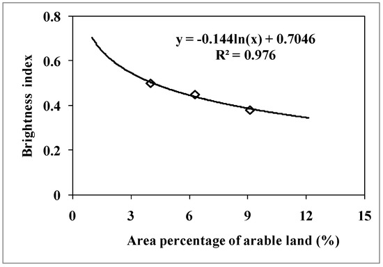 Figure 8 shows the relationship between BI and percent area of arable land. BI decreased with increasing area of arable land, and the trend was stronger than that for WI. Urban sprawl has occupied a large area of arable land, leading to reducing arable land yearly. Therefore, BI increased from 2003 to 2015.