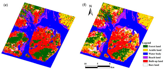 Our research also explored temporal changes in LULC in the study area. Built-up land showed a 0.56-fold increase over the past 12 years. The rapid extension of built-up land was mainly due to occupation of coastal reclamation, arable land, and forest land.