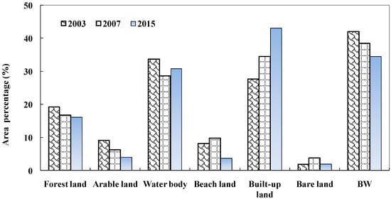 LULC changes in the study area from 2003 to 2015. Note: BW is the sum of beach land and water bodies.