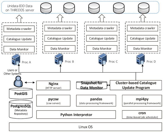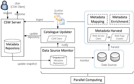 In order to discover geospatial data or model resources using an OGC CSW service, metadata must be registered and pushed into the metadata repository using an OGC CSW service. For real-time or near-real-time geoscience data, the metadata repository requires frequent updates to maintain accordance with data sources. Considering the velocity and volume characteristics of geoscience big data, the amount of metadata to be updated could be extremely massive and the update frequency is very high. In this situation, parallel processing approaches have to be considered. In addition, the catalogue updater and data source monitor, which are indispensable elements for a near-real-time catalogue service, should be executed in parallel.