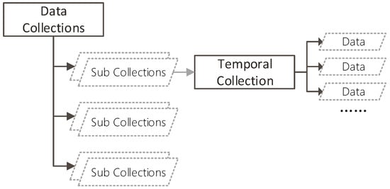 Figure 4 shows that the data are usually archived at two levels: collection level and granule level. The collections can have sub-collections, and they are a form of hierarchical structure. Taking remote-sensing image data as an example, the data with the same sensor type can be one type of collection, the data with the same tile can be another type of collection, and the data with the same date can be another type of collection, etc. The granule level refers to the actual data, which are accessible via a downloadable data file or web services. Since the amount of geoscience data is normally very large, data collection is very useful in cataloging and archiving data. In particular, for the near-real-time data, one important type of collection for which the data will normally be archived is the temporal collection type; that is, collections identified with dates or times. Therefore, the data source monitor does the comparative analysis on the temporal collection type. The algorithm of comparative analysis is implemented based on the temporal topology relationship. With the temporal collection type, the data source monitor can quickly find the changes in data records and improve the efficiency of the catalogue update