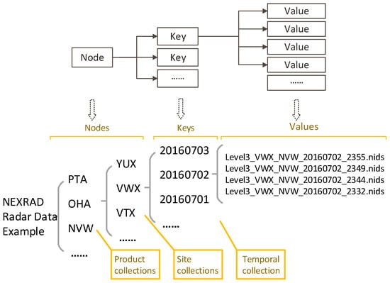 The snapshot of the metadata repository is designed based on the data-archiving model, and it does not copy all metadata information of the repository. The elements of the snapshot track the elements of the data source monitor, including the URL of multi-level collections, the date and time of the temporal collection, and the identifier and the URL of the data. The snapshot adopts a node-key-value structure, as shown in Figure 5. The URL path of hierarchy collections is the node of the snapshot, which facilitates parallel processing on different servers. The date of a temporal collection can be the key of the snapshot, and sometimes the time of the temporal collection can be the key as well. The key is used for comparison with the data sources in the comparative analysis algorithm. The value part of the snapshot is a list of the data corresponding to the temporal collection. Each element of the list only records the data identifier and its accessible URL. More metadata information is accessed through the URL in the update phase, not the monitoring phase. This idea also helps to save much more time in monitoring the data record changes, and the data list in the value node can be processed in parallel at the thread level on a single server.