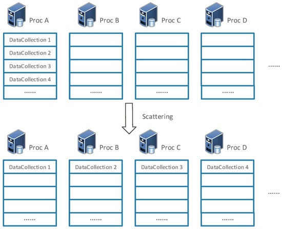 In the process of a catalogue update, collective communication is adopted to split a large catalogue update task, because collective communication endeavors to utilize all the time of all processes for data transmission between multiple processes. It can be seen that collective communication is more efficient when applying a catalogue update. Based on the snapshot file for data monitoring, a large catalogue update task is scattered in clusters in terms of nodes of the snapshot. The nodes store data collections, as shown in Figure 6. With cluster-based parallel processing, efficiency gains are in proportion to the number of server machines in the cluster.