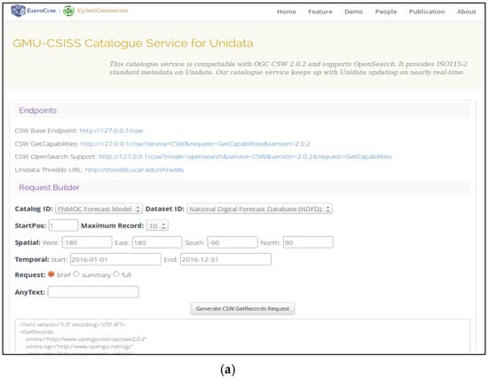 The framework of the prototype is shown in Figure 7. We employ five server machines, which work as a cluster, in this application case. One machine is responsible for providing OGC CSW services. The other four machines are responsible for monitoring real-time data sources and updating the metadata repository frequently. The prototype runs on the Ubuntu operating system and is built in the Python environment. pycsw, pandas, and mpi4py are all Python packages. “pycsw” is served for providing OGC CSW services, “Pandas” for data monitoring analysis, and “mpi4py” for parallel catalogue updates. An OS-level job scheduler “cron” is used for timing-based catalogue updates. The cluster-based catalogue update program in Figure 6 is scheduled with the Linux job scheduler “cron.” The cluster-based catalogue update program starts four processes for executing catalogue updates in parallel. We also developed a THREDDS catalogue crawler for fetching ISO 19115 metadata from the THREDDS catalogue. In order to test the OGC CSW service, we developed a web CSW request builder, as shown in Figure 8a. With this builder, users can build any CSW request against Unidata IDD data and make a query with the request. Figure 8b shows the XML-encoding response of the near-real-time CSW service.