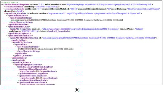 (a) CSW request builder for querying Unidata IDD data; (b) XML-encoding response of the CSW service.