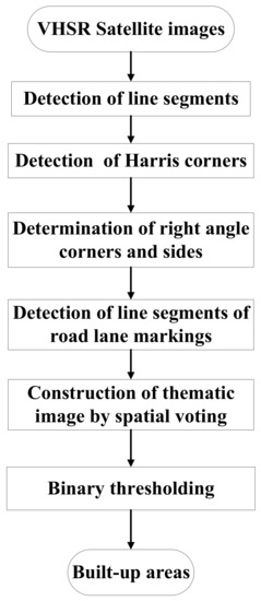 In VHSR remotely-sensed images, built-up areas contain a number of corners from building roofs, roads and other man-made objects [16]. Many corner detection methods, such as Harris [28], FAST [29] and SUSAN [30], have been designed in the computer vision field. Among them, the classic Harris corner detector and its variants are popular for extracting man-made structures in urban areas [31]. The work done in [2,16,17] has proven that the classic Harris corner detector is an effective and robust algorithm for corner detection.