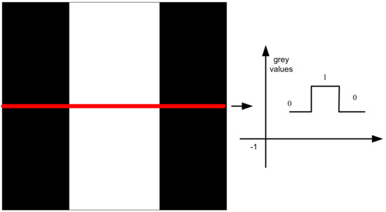 In VHSR satellite panchromatic images, such as QuickBird and WorldView2, a road lane marking is approximately one pixel in width, and its grey values are larger than its nearby backgrounds. Moreover, only the straight-line-segment-shaped road lane markings are concerned. In this article, template matching is employed for detecting road markings. In [37], the template matching using the correlation coefficient as a similarity measure was used in the recognition of road centerline points. Suppose there was a binary bar-shaped reference template, as shown in Figure 5. To detect and locate the centerline points of the bar-shaped roads, the template matching, which correlated the bar-shaped reference template and the image, evaluates the similarity between the reference template and the image; therefore, the centerline point candidates were detected based on the local maximums of the correlation. As a result, we apply the above template matching to VHSR satellite images for the extraction of road lane markings.