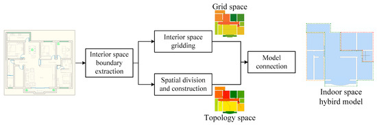 As shown in Figure 1, the proposed indoor space hybrid modeling approach includes four steps: Firstly, the indoor space boundary is extracted from the boundary of the wall and the fixed obstacle according to the original plan of the building. Next, the interior space is divided into subspaces. Then, the meso space is meshed by the interior space boundary. Finally, through the model connection, the connection between subspace and topological subspace is established.