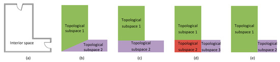 Topological subspace division of the different results: (a) A room in interior space.; (b) The first case of topological subspace division; (c) The second case of topological subspace division; (d) The third case of topological subspace division; (e) The fourth case of topological subspace division.