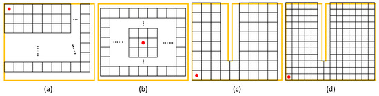 Figure 3a,b show the topological subspace gridding results based on method 1. The reference points are the upper left corner and the center point, respectively. It can be seen that although this method is practical and flexible, and different grid sizes can be selected according to the characteristics of the topological subspace, it is easy to leave a gap in the topology subspace boundary, resulting in an edge between the topological subspaces. Figure 3c,d show the results of the indoor spatial division based on method 2 and the reference point in the lower left corner of the different grid sizes. The advantage of this method is that the processing is convenient, but the results are the effect of grid size. Compared with Figure 3c,d, the smaller the grid size, the more accurate the wall is expressed.