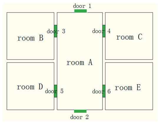 Different interior space applications determine the size of the grid size selection. In the indoor positioning navigation application, because the application of the object is human, generally choose the average size of the human body as the grid size, and the average size is 40 cm × 40 cm [34]. In the application of indoor emergency evacuation, consider the rapid movement of people, the general use of the average step size as a grid size, approximately 70 cm × 70 cm [35,36]. For smaller indoor applications, such as indoor gas diffusion simulation, a smaller mesh size is required [37,38]. In order to minimize the number of grids, we guarantee that the topological subspace occupied by the gate is at least one grid width. Therefore, the grid size is the thickness of the wall where the gate is located.