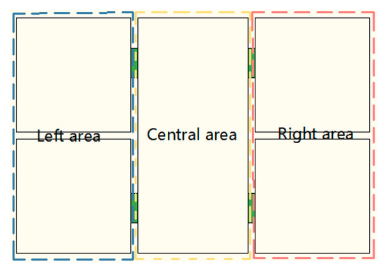 In the interior space, high-level space is composed of a number of low-level subspaces, these subspaces with common features or locations can be divided into classes. As shown in Figure 5, the example indoor space can be simply divided into left, middle, and right areas. Similarly, residential can also be divided into public areas and living areas. Large shopping malls can also be based on the layout of the shop layout and indoor trails on the overall space. The complex interior space is divided into several different features that simplify the search of the indoor topology path. Through several parts of the connection elements, the search can quickly be conducted from the starting point to the end of the topology path. There is no need for unnecessary searching.