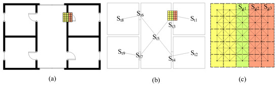 Figure 6a is a simple interior space plan. Figure 6b is the topological subspace obtained by spatial partitioning and the topological subspace connectivity graphs based on adjacency relations. Figure 6c is a grid subspace and a grid subspace join graph based on eight neighborhood relations. Because grid subspaces Sg1, Sg2, and Sg3 are in the topological subspaces St1, St3, and St5 respectively. The corresponding “Belongto” attribute values are assigned to Sg1, Sg2, and Sg3 respectively. In Figure 6, we use different colors to represent different grids with different “Belongto” attribute valuesTherefore, the interior space hybrid model can be regarded as the combination of the topological subspace linkage graph and the grid subspace connectivity graph , which is , meet , makes . The structure of “Index” and “Belongto” are shown in Table 4 and Table 5.