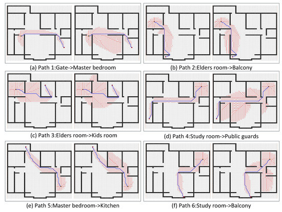 In this study, typical interior home activities, including entrance rest, balcony viewing, caring for children, work and study, kitchen cooking, leisure and entertainment—a total of six paths—were chosen. Based on these six paths, the query results of the shortest path analysis were compared with the A* algorithm and the optimization algorithm in this paper, as shown in Figure 10. In each roadmap, the left side is the result of the optimization algorithm based on the hybrid model. The right side is the A* algorithm based on the grid model. The red line represents the shortest path tree of the traversed points in the path query process.