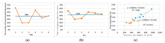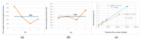 The data were analyzed and line and scatter plots drawn, as shown in Figure 13. Figure 13a,b show that the optimized A* algorithm based on the hybrid model has a significant efficiency advantage over the A* algorithm based on the grid model in the typical indoor activities. Among them, orange lines indicate the effficiency increase of each path, blue lines indicate average efficiency increase. The number of grids traversed and the algorithmic time consumption were reduced by an average of 28% and 43%, respectively. Figure 13c shows the linear correlation between the number of traversed grids of different algorithms and the time consumption. It can be seen from the blue line that the traversed grid number and time consumption of the traditional A* algorithm based on the grid model show a significant positive correlation (coefficient = 0.993). It shows that the time taken by the algorithm increases with the number of grids. In contrast, the correlation between the number of traversed grids and the time consumption of the algorithm is not obvious which can be seen from the orange line (coefficient = 0.325). With the increase in the number of grids, the time consumed is not obvious.