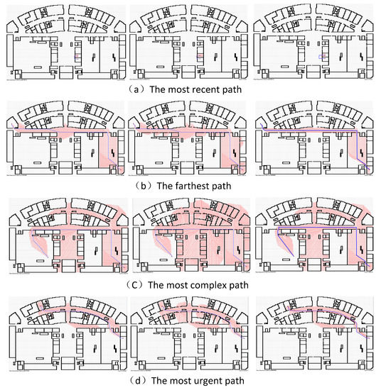 The mall’s range of activities is a 51 m × 82 m rectangle. In the indoor activities of the mall, the pace of the customer is relatively slow. In this experiment, the average step length was chosen as 40 cm × 40 cm for the grid size; the whole rectangle was divided into 128 × 205 grids. This study chose four typical mall indoor activities: the most recent path (two adjacent stores), the farthest path (two stores at both stores), the most complex path (from the corner of the mall to the corner of the supermarket), the most urgent path (from the restaurant to the bank owing to lack of cash). The first three scenes are space-based activities, corresponding to the shortest, longest and most complex in space. The fourth scene is based on the time activity, corresponding to the actual situation in the emergency situation. Based on these four activities, the query results of the shortest path analysis were compared with the optimization algorithm of A* and this algorithm, as shown in Figure 12. The left subimages are results of the optimized algorithm in the hybrid model. The central subimages are results of the A* algorithm in the grid model. The right subimages are the results of lines smoothed. The red line represents the shortest path tree of the traversed points in the path query process.