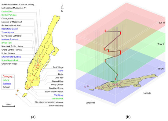- Regarding the first factor, landmarks are classified into L distinct categories, where landmarks in each category are semantically homogenous on the basis of common sense [31]. In this way, a semantic topological travel motif can be transformed into an L-type semantic-category sequence. For instance, “The Museum of Modern Art → Bryant Park → Times Square” is represented as “Cultural → Business → Natural”. In this sense, a semantic travel sequence is formally defined as:where denotes the semantic category of the i-th location.