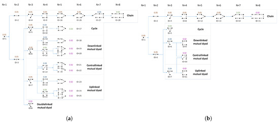Dendrogram of topological travel motifs based on (a) discrete sequence and (b) consecutive sequence. Note that N denotes the number of attractions within the identified motif; the value above each motif indicates the threshold for detecting it as a significant motif; and the “double-linked mutual dyad” motif is excluded for analysis in that its corresponding threshold is lower than .