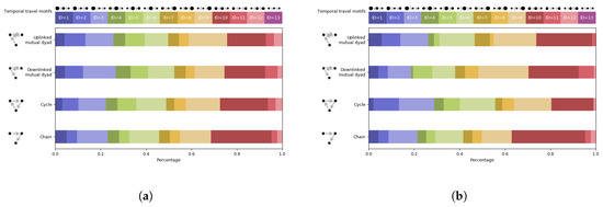 Temporal travel motifs denoted by the first landmarks are illustrated in Figure 4a,b. Based on the duration of stay at these three locations, temporal travel motifs are assigned to categories as: { “⚫→→”, “⚫→→”, “⚫→→”, “→⚫→”, “→⚫→”, “→⚫→”, “”→→⚫”, “→→⚫”, “→→⚫”, “→→”, “→→”, “→→”, “→→”} , where the size of the filled circle shows the relative duration of its staying time at each location. Note that we take durations of stay of two landmarks as the same order if they differ in less than 10 min. Besides, the blue series (ID = 1, 2, 3) denote motifs having the first place with the longest staying time, whereas the green series (ID = 4, 5, 6) for the second place, the brown series (ID = 7, 8, 9) for the third place and the other color series (ID = 10, 11, 12, 13) for other patterns.