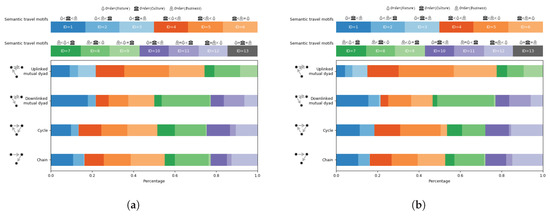 As illustrated in Figure 5a,b, dominant semantic travel motifs are quite different for topological travel motifs associated with distinct structural morphologies (please refer to Figure 3). Recall that landmark semantics are represented in terms of types of categories as {“natural”, “business”, “cultural”}. Based on the semantic ranking of each category of landmarks within tourists’ travel sequences, we identify categories of semantic travel motifs as: { “