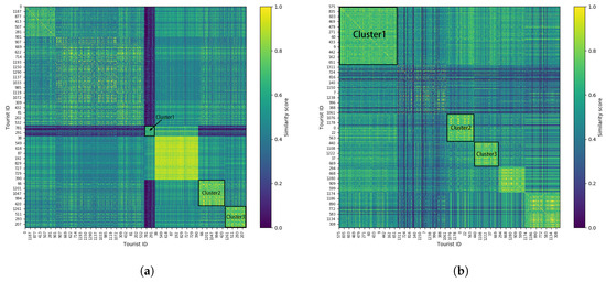 Based on the travel motif-based clustering framework introduced previously in Section 2.3, the similarity scores between each pair of 1312 users that have travel trajectories with at least two nodes are measured. Since topological, temporal and semantic travel motifs are categorized into , and respectively, each tourist is represented by a 31-dimension vector. The resultant similarity matrices are illustrated in Figure 6a,b, after performing hierarchical clustering method. Note that in this research, hierarchical clustering is implemented by using Euclidean distance as the metric for calculating each pair of vectors and the average-link clustering criteria as a function of the pairwise distances of vectors in two clusters [33]. In the similarity matrix, each row represents a similarity vector with 1312 elements, which are the similarity scores with himself/herself and other users. All users’ vectors constitute the similarity matrix (1312 rows × 1312 columns).