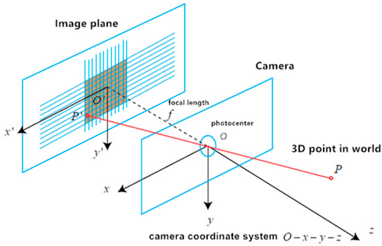 Let P(X,Y,Z) be a 3D point in the world coordinate system. While Pc(Xc,Yc,Zc) is its corresponding point in the camera coordinate system, P′(X′,Y′) is the corresponding image physics coordinate, and the corresponding image pixel coordinate is p(u,v).