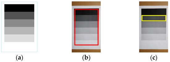 Stripe plane pattern with different grayscales printed on A4 paper: (a) stripe plane pattern on A4 paper; (b) red box region; and (c) yellow box region.