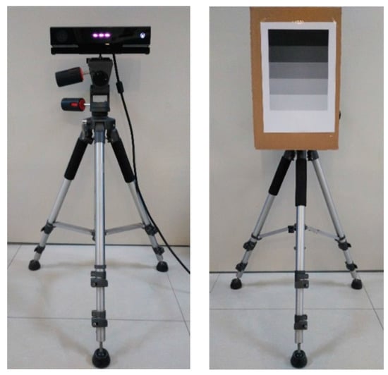 We fixed the calibrated Kinect v2 sensor to a stable tripod, and mounted the stripe plane pattern to the other tripod. As shown in Figure 5, the front panel of the Kinect v2 sensor and the stripe plane pattern are always maintained in parallel, both perpendicular to the ground, using a large triangular rule to guarantee alignment. The stripe plane pattern is progressively moved away from the Kinect v2 sensor in the operative measuring range with a step length of x meters (less than 0.20 m). Therefore, L sets of depth images of the yellow box region are captured. One set contains N (no less than 1) depth images.