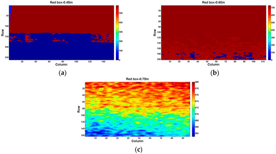 Visualized depth images of the red box region at different distances (front view): (a) 0.45 m; (b) 0.60 m; and (c) 0.75 m.